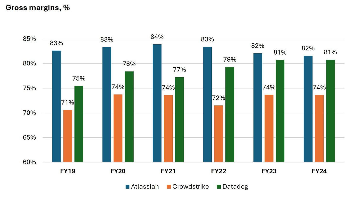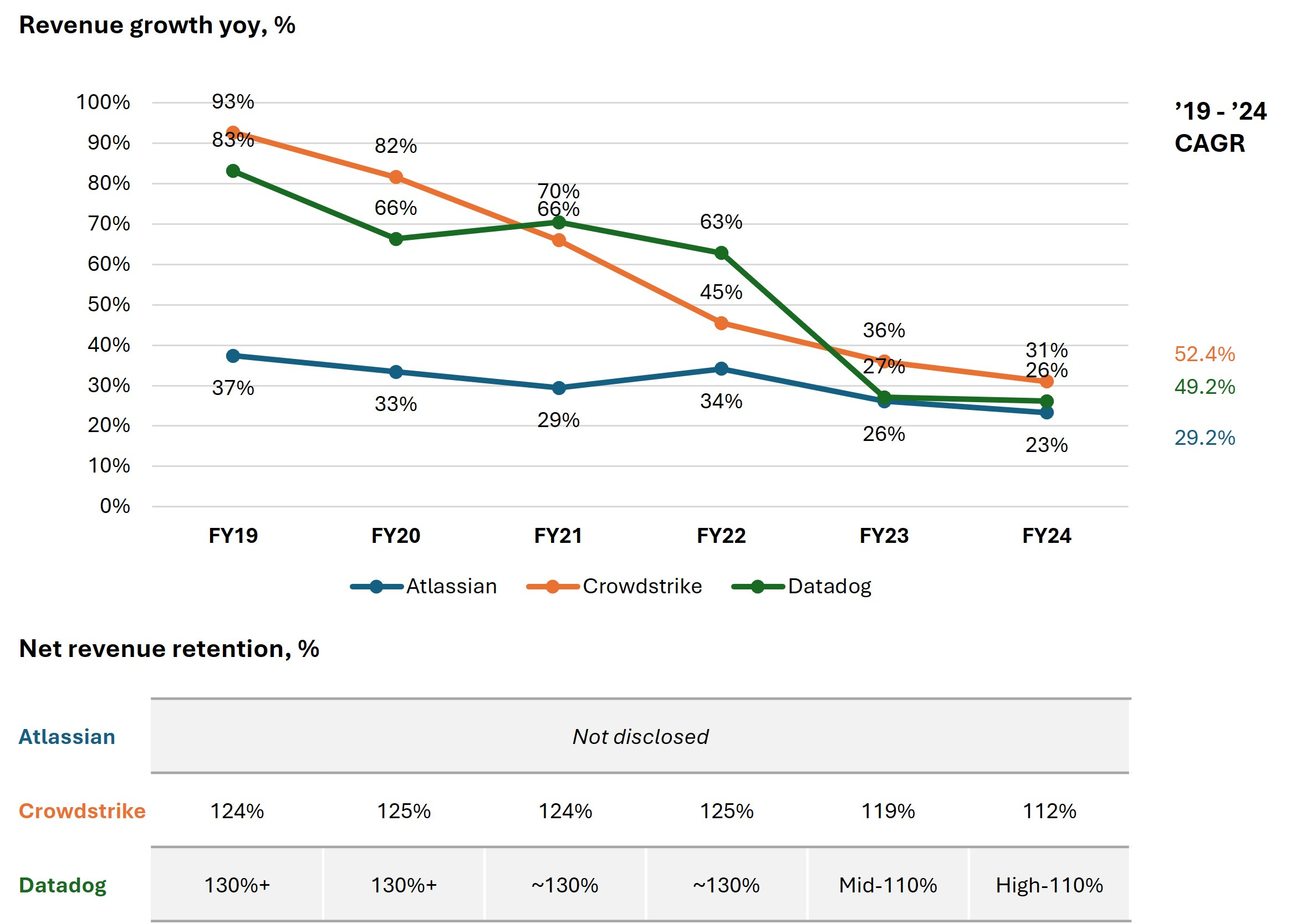 Over the past five years, these companies have delivered strong revenue compound annual growth rates: 29% for Atlassian, 49% for Datadog, and 52% for CrowdStrike.