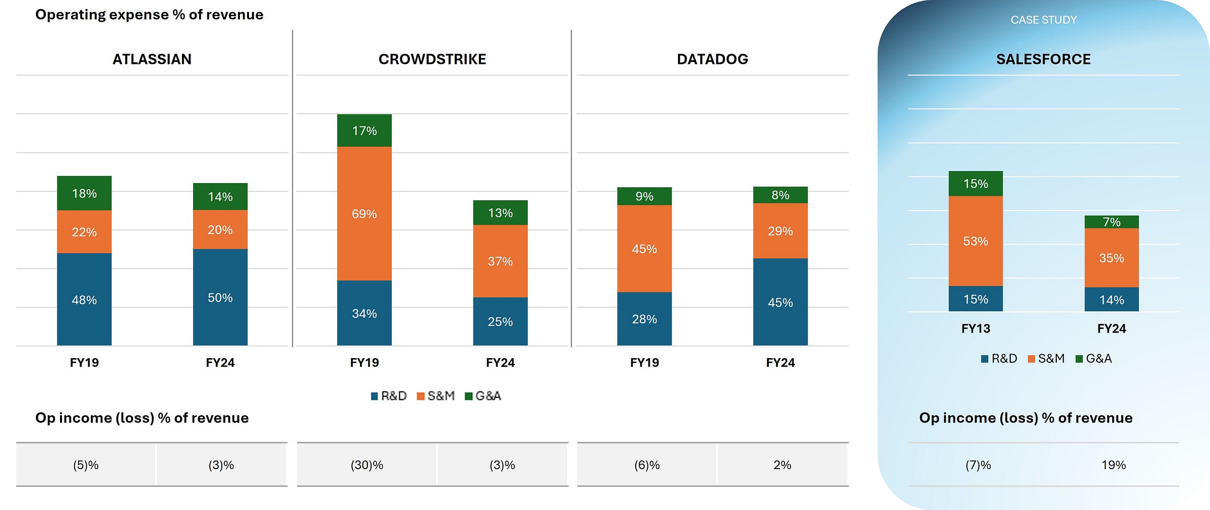 Despite this, all three have executed exceptionally well. They’ve grown into market leaders and continue to invest both organically and inorganically to build broader platforms. But unlike Salesforce, they’ve had little room to consolidate their market positions. They must continue spending heavily to defend their positions.